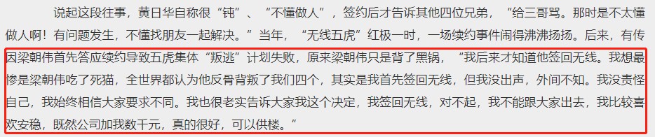 后来别的电视台想挖角,只看中梁朝伟和刘德华。刘德华认为五虎是一体,要走一起走,要留就由他代表大家和TVB谈涨薪。