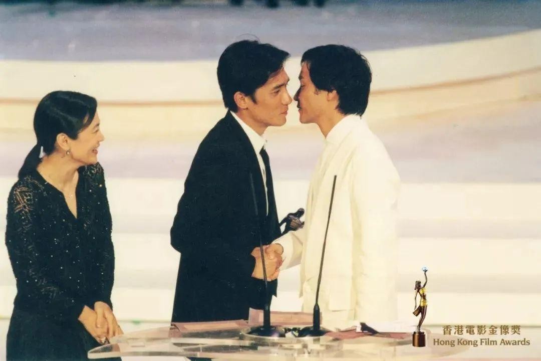 颁奖的是周润发和梅艳芳,趁着梁朝伟喝醉了,都笑着向他索吻。
