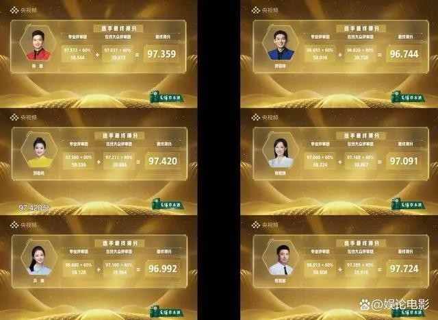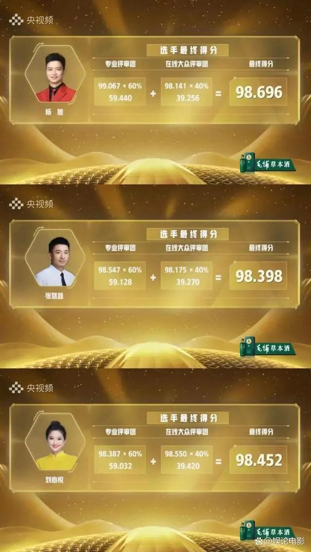 第二轮比拼其实难度很大,因为过程有反转,结果有的主持人判断失误,但张慧鑫、刘心悦和杨旭表现都很不错。张慧鑫两场分数是 97.866 分,杨旭 97.778 分,刘心悦 97.706 分,他们三个每一场的分数都是居于前三甲。