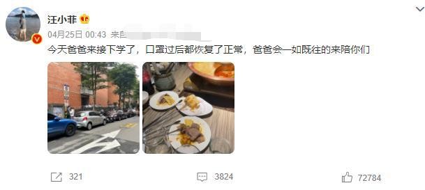对此台媒和大陆网友的看法却截然相反,4 月 25 日凌晨汪小菲还 PO 文表示自己接孩子下学,并晒出两张照片,一张孩子学校外的街景照,一张用餐照。