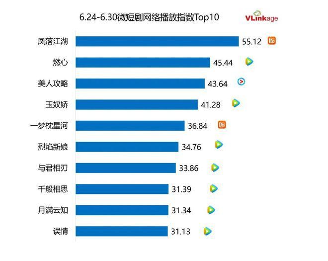 在微短剧赛道,上周热度最高的剧集为《凤落江湖》,经过两周的热度发酵,该剧在上线第三周时热度达到峰值,网播指数高达 55.12。上周新上线的《燃心》也表现不俗,上线首周热度在 45+。上周热度在 40+ 的还有《美人攻略》和《玉奴娇》。