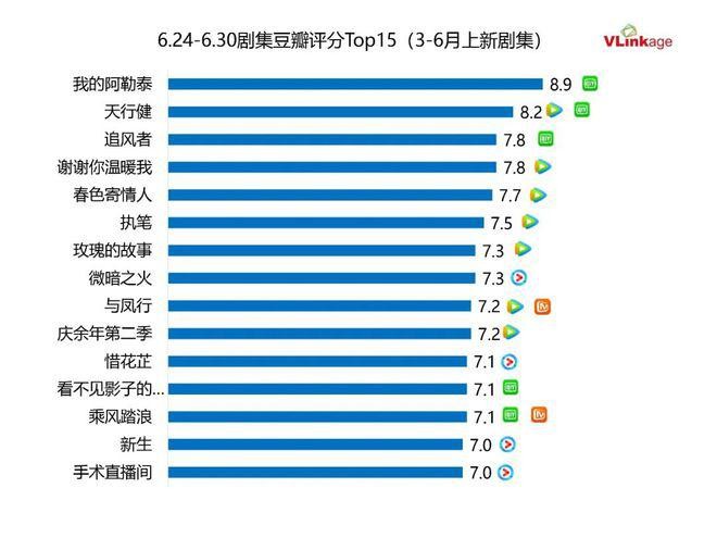下图为今年 3-6 月首播剧集豆瓣评分 Top15,口碑达到优秀线的依然只有《我的阿勒泰》和《天行健》。