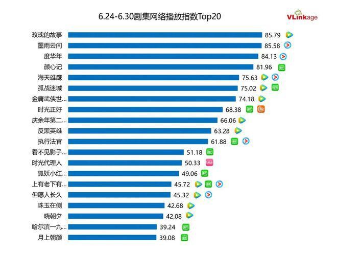 下图为上周剧集网播指数 Top20,热度在 80+ 的剧集有 4 部,均为女频剧。其中网播指数最高的剧集依然为《玫瑰的故事》和《墨雨云间》,这两部剧自上线后便保持热度高位,上周热度均在 85+。