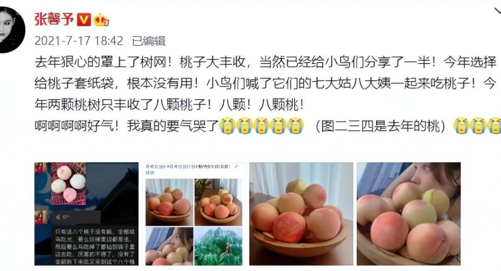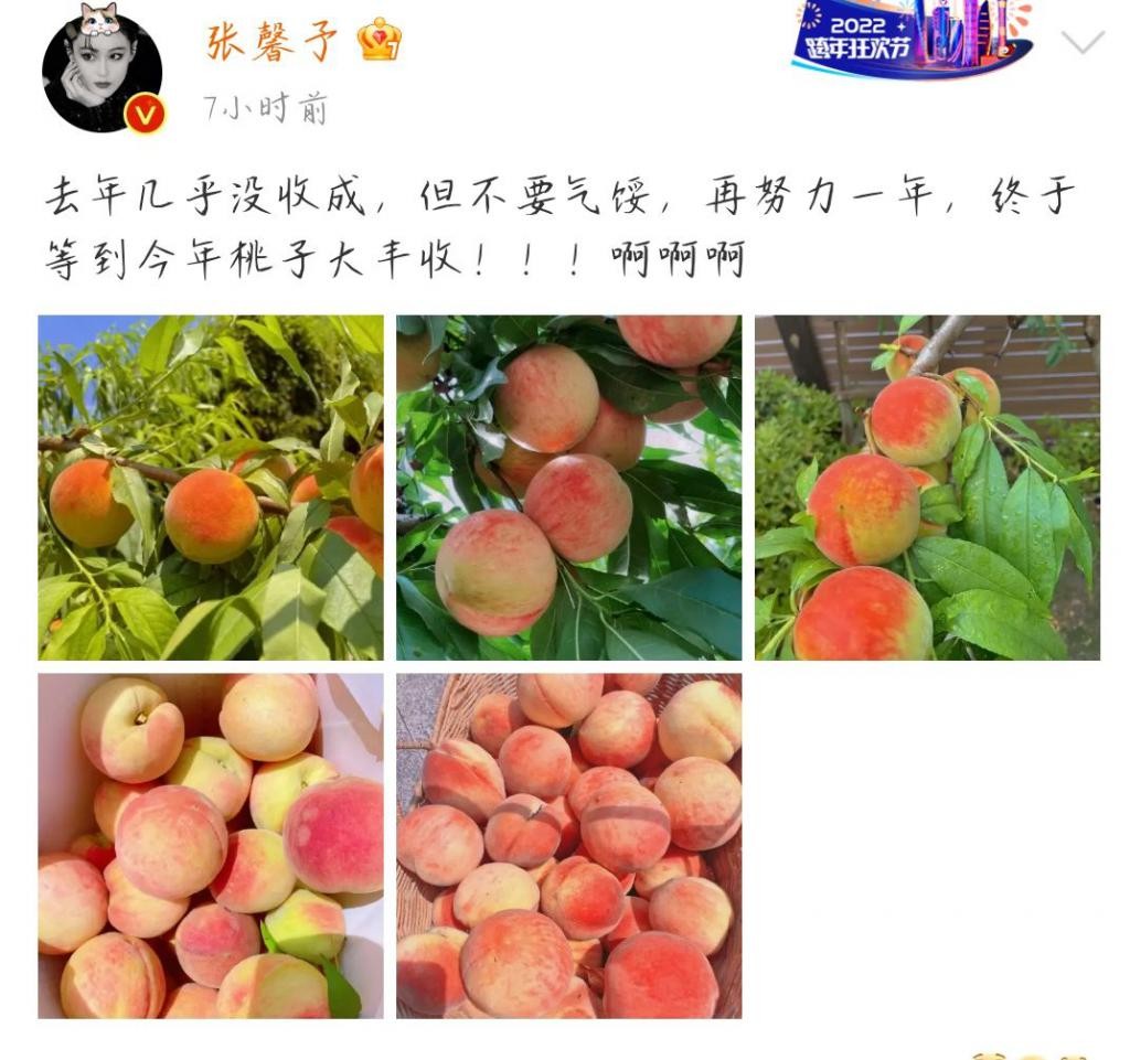 近日,张馨予更新个人社交平台动态,激动发文:" 去年几乎没收成,但不要气馁,再努力一年,终于等到今年桃子大丰收!"。
