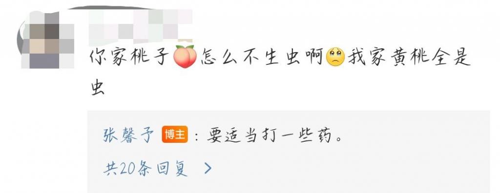 结果粉丝们又纷纷表示自己可以过去自提,哈哈哈。还有粉丝来取经问道:" 你家桃子怎么不生虫啊,我家黄桃全是虫。" 张馨予也是如实相告说:" 要适当打一些药。"