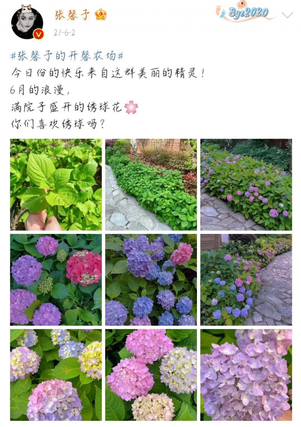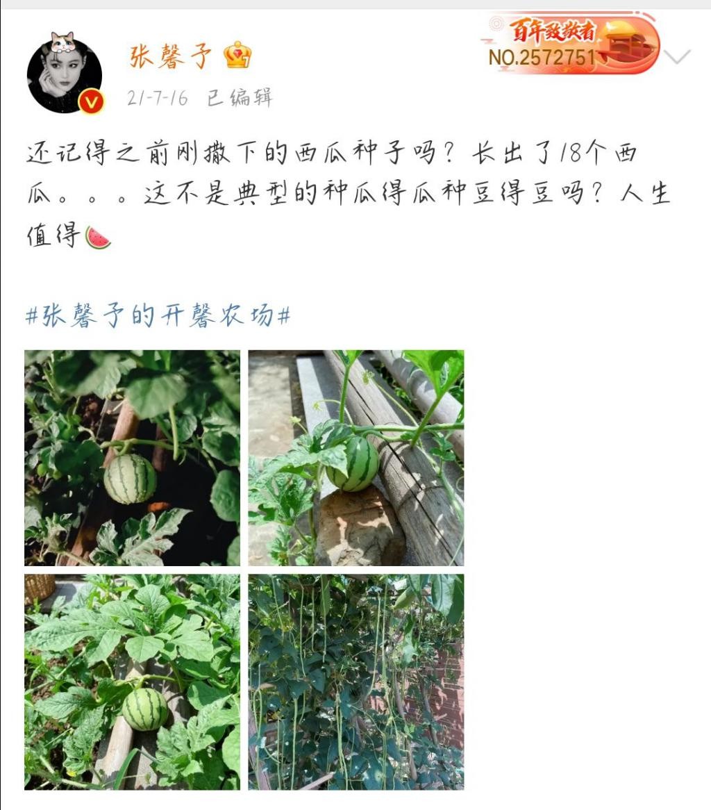 张馨予这几年在家的生活很是悠闲自在,把后院整理得井井有条,植物应有尽有,除了平时吃的蔬菜外还种植了各种各样的花,五月的月季,六月的绣球花,去年在后院撒下了一些西瓜籽儿,竟长出了 18 个西瓜,张馨予自己也乐在其中,非常享受种植的过程,在喧嚣的世界中拥有自己的一片宁静之地。
