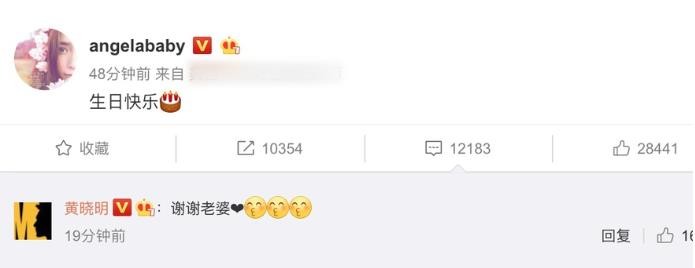 随后黄晓明在微博评论里回复称:“谢谢老婆~”还配上了亲吻的三个表情,很是甜蜜。