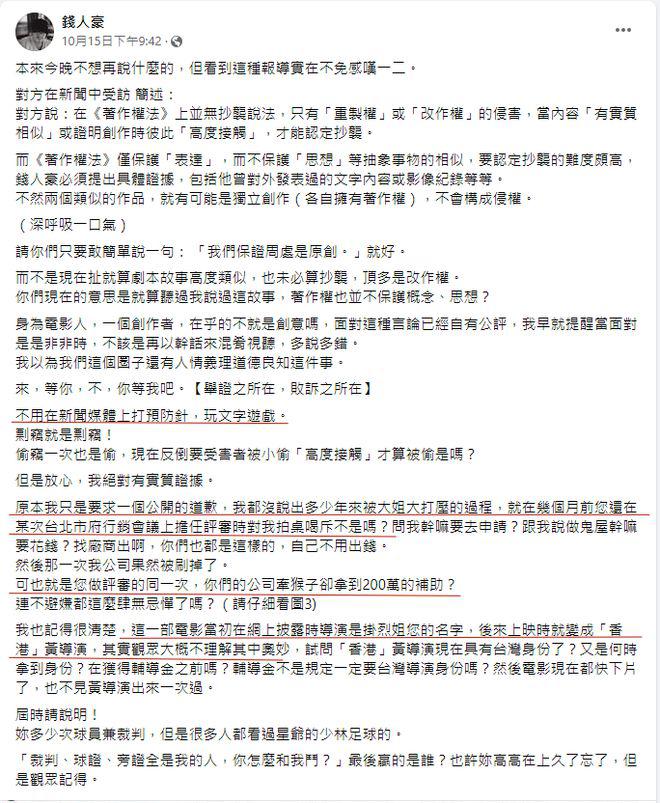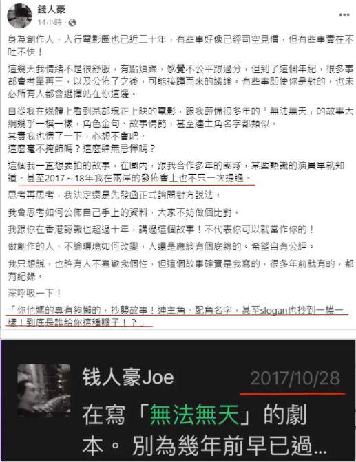 如今钱人豪索性在脸书公开带有写作时间的完整剧本,正式起诉电影《周处除三害》剽窃创意。