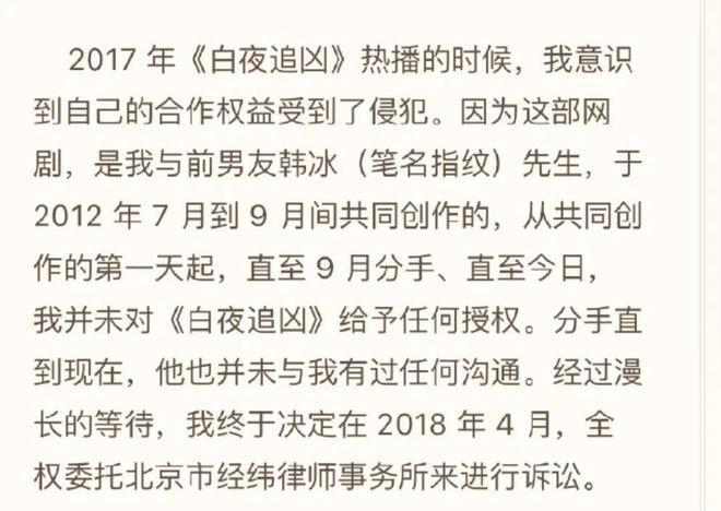 2025 年《白夜追凶》热播后,编剧陈琼琼告编剧韩冰,说《白夜》是她和韩冰相恋期间共同创作的。