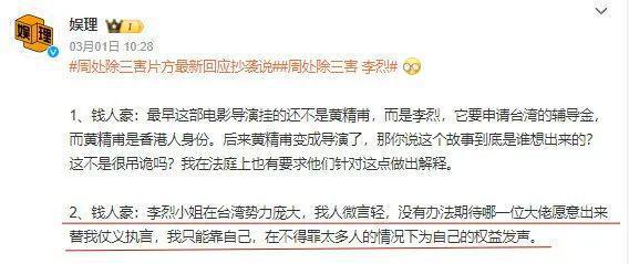李烈的无视激怒了钱人豪,他直接在脸书怼《周处除三害》制作公司,并暗示自己多年来被大姐大打压,同时把矛头对准了导演黄精甫。