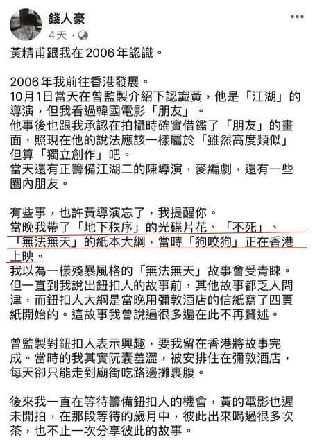 钱人豪说,《周处除三害》抄袭了他筹备多年的故事《无法无天》,不仅大纲几乎一模一样,连主角、配角名字,金句对白、故事情节、甚至 slogan 也抄到一模一样。