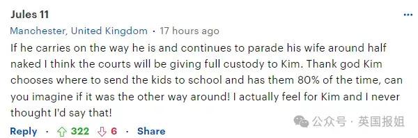 万幸金选择送孩子去学校上学,能陪伴孩子 80% 的时间,要是真让侃爷带孩子绝对是个灾难。从来没想过我会这么说,但我是真的同情金!"
