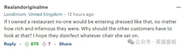 " 我要是餐厅老板,甭管多有钱多有名,谁穿成那样都别想进来。其他顾客做错了什么要看这个啊?希望餐厅会给她(比安卡)坐过的椅子消毒。"