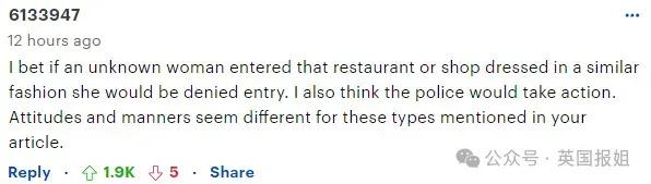 " 我敢打赌,如果是某个不知名的女人穿着类似的服装进入那家餐馆或店铺,她肯定会被拒绝进入,我觉得警方也会采取行动。"
