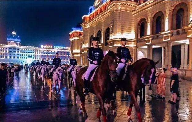 飞马水城有特色马队巡展,骑手们骑着马,两人并排一组,大概有上百匹马绕着大广场走队,场面那叫一个壮观: