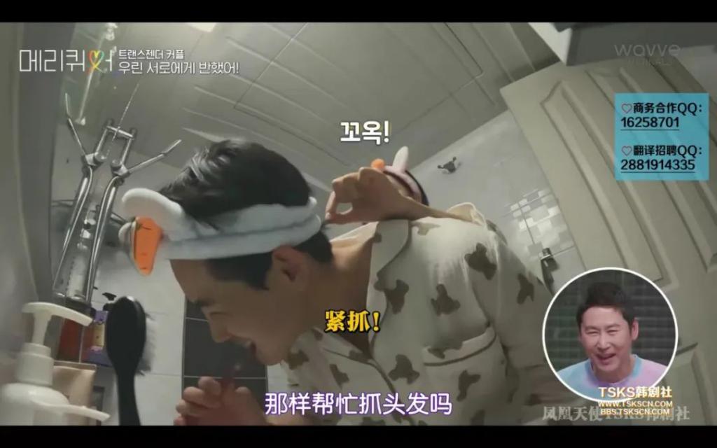 穿着同款睡衣,戴着情侣束发带,两个人挤在不算宽敞的洗漱间里洗脸刷牙,对方弯腰漱口时帮忙抓头发。