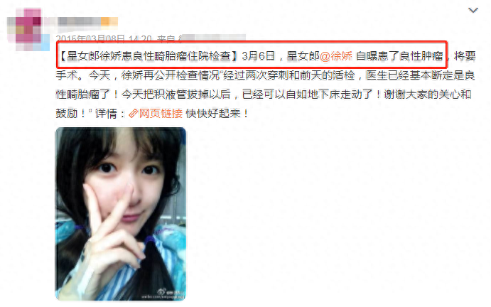 据悉,徐娇当年患的是良性畸胎瘤,虽然治疗过程非常艰难,但她对待病情一直十分乐观,也经常会把自己的状态和粉丝们分享。