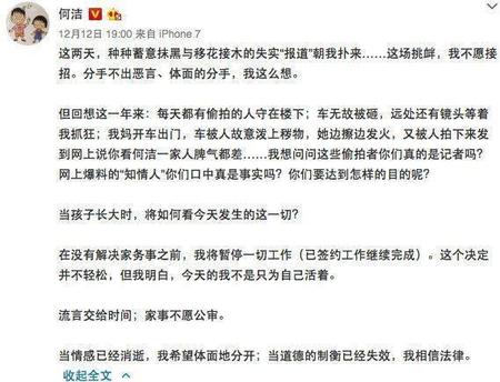 直到2017年的离婚大战,撕开了彼此恩爱的面具,赫子铭被指出轨,而且玩游戏忽视孩子,没工作不求上进,甚至动手家暴何洁。一时间赫子铭被打上了渣男的标签。同时,何洁约会刁磊的图片被曝光,继而传出何洁出轨刁磊致其离婚。何洁当即在微博作出反击。