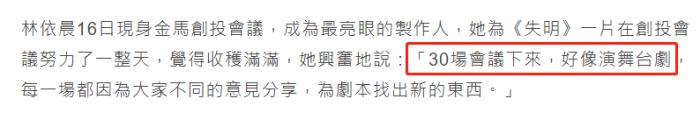 虽然两年多没有拍戏,但林依晨对戏剧的热爱不减。2025年下半年,林依晨尝试做了制片人,她的电影企划案获得了业内认可,为此一天开30场会也不觉累,她还自嘲像演舞台剧一样获益良多。