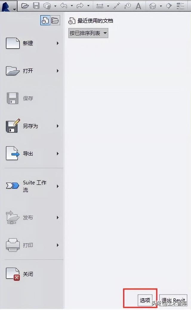 1、在Revit软件中,选择应用程序图标,在下拉菜单选择“选项”;