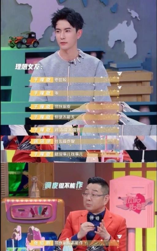 现在的于朦胧已经是很火的明星了,只要明星一火就会被各种媒体和记者采访,在最近的综艺节目《喜欢你我也是》里被记者问到感情问题,于朦胧回应了自己选择理想女友的标准,于朦胧说:要比较乖,可以调皮,但是不能太太强势,就是没事找事那种。张绍刚总结说:可以调皮,不能做作。