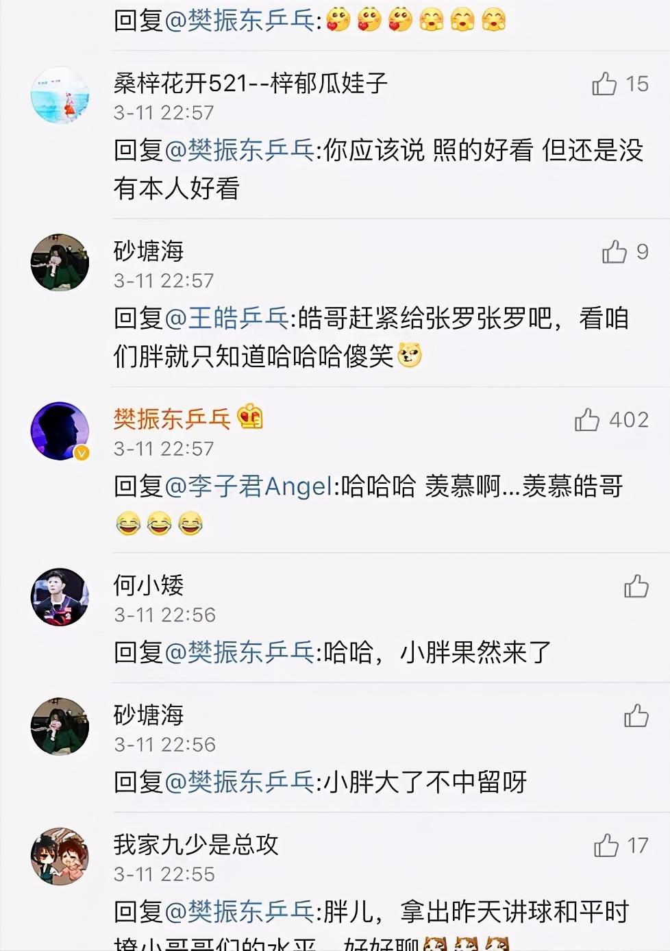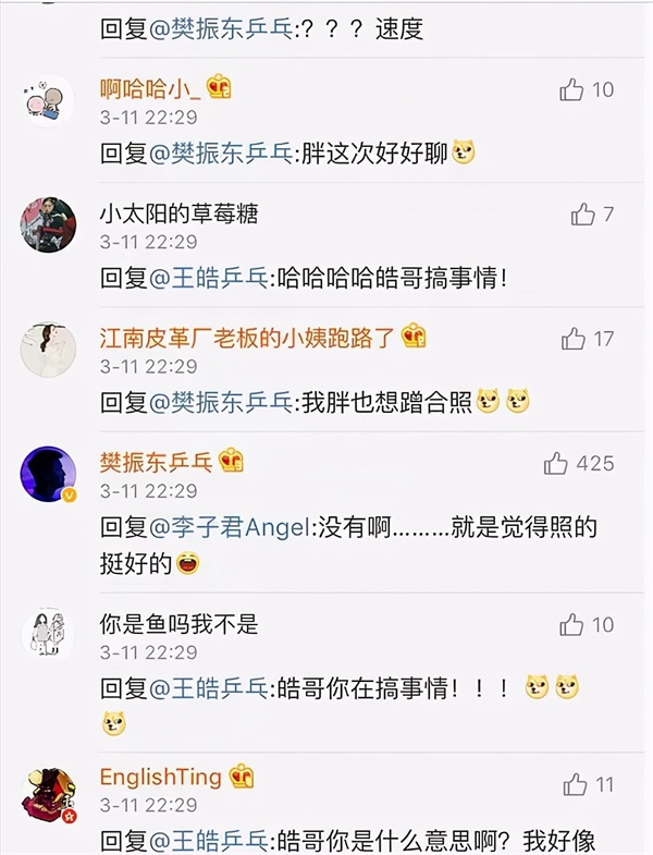 让这一绯闻到达顶点的是樊振东的主管教练王皓有一次在微博上发了自己参加活动和李子君的合影,樊振东还在下面评论非常羡慕王皓,而王皓则八卦的表示樊振东也想去。