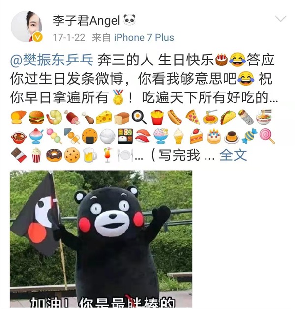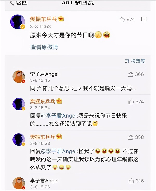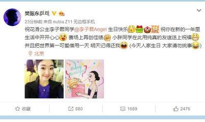 两人还互发生日祝福,在樊振东20岁生日的时候,李子君微博祝福他的生日,还专门表示这是自己答应樊振东要发,可见当时两人应该是都有好感的。