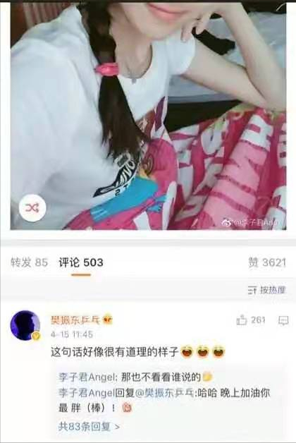 许多关注樊振东的球迷就发现樊振东经常会在李子君微博下面留言,还称呼李子君为“漂亮姐姐”,并且每次都是很快就有评论,网友们就怀疑樊振东可能对李子君是特别关注。