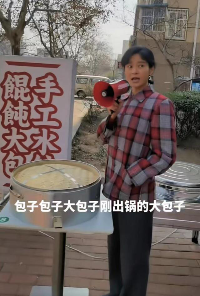 女星在街边摆摊卖包子,手拿话筒热情吆喝,站笼屉前打扮简朴