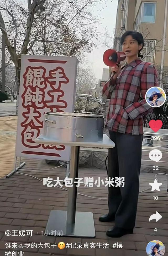 2 月 23 日,女演员王媛可就加入了摆摊大军,她拿着话筒喊话:" 谁来买我的包子?"