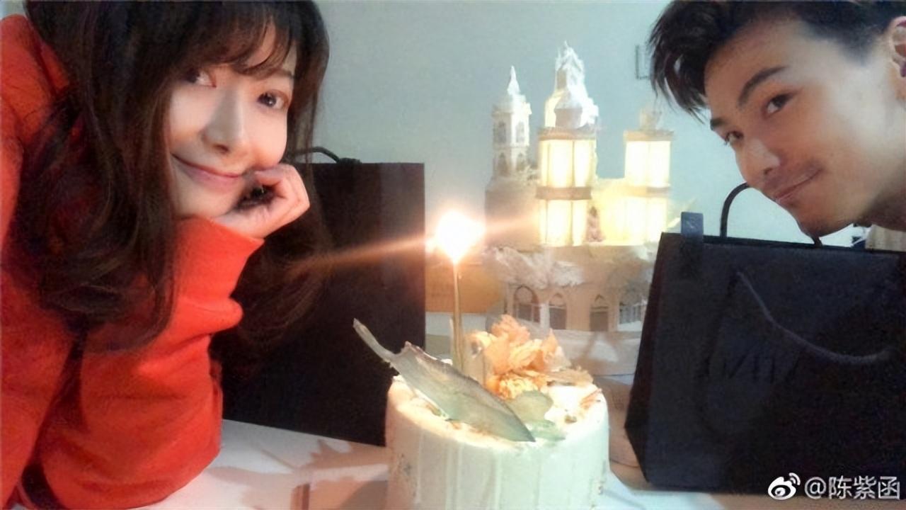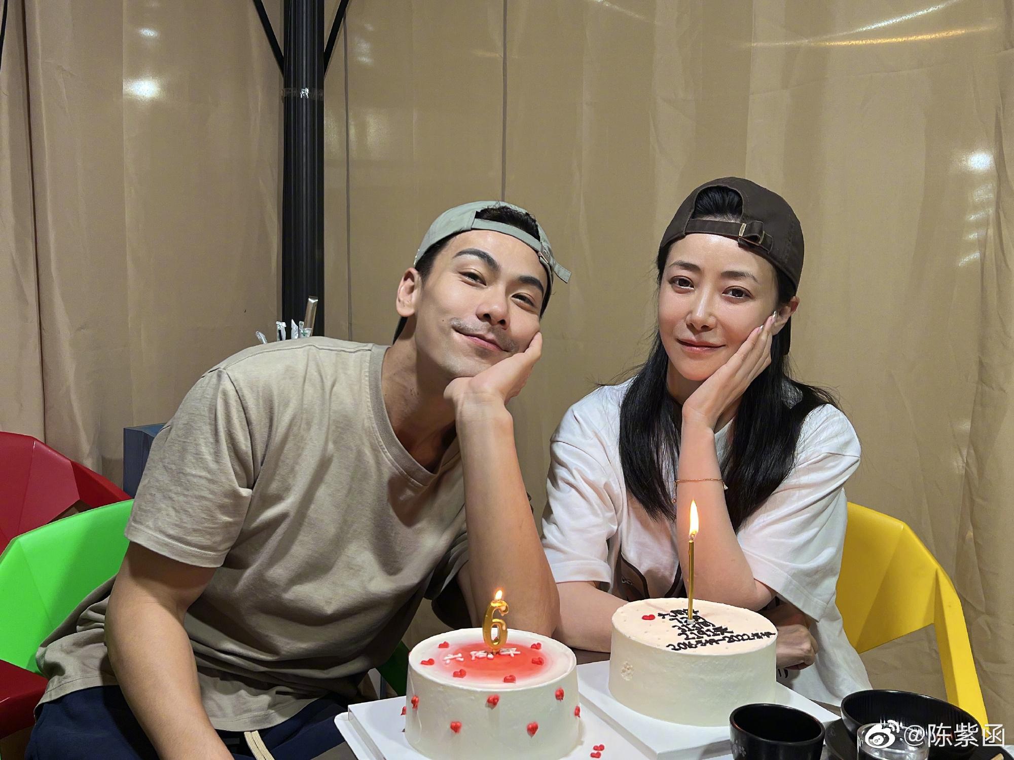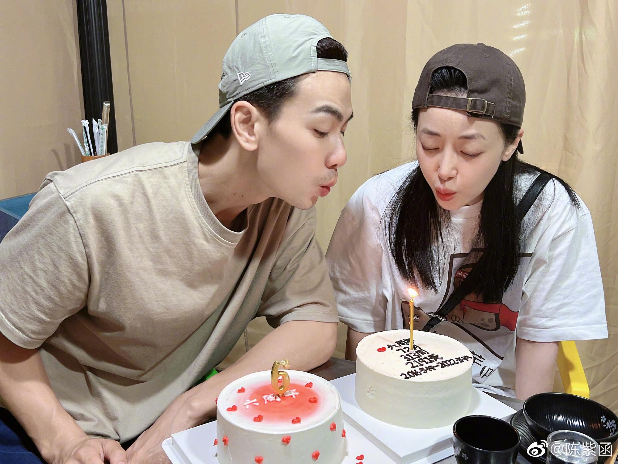 坐在蛋糕前的“御寒夫妇”,默契单手托腮、对着镜头面露浅笑,甜过浪漫二人世界。不知是拍摄角度的问题还是摄影师灯光不行,这一张夫妇合照明显不如第一张,特别是47岁的陈紫函皮肤松弛、黯淡无光,皱纹明显、颇有些憔悴显老态,看来是连轴转的拍戏令其太辛苦!
