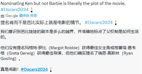 以至于高斯林也对此提名发表长文,表达对奥斯卡忽视《芭比》里两位主创的行为感到不满——