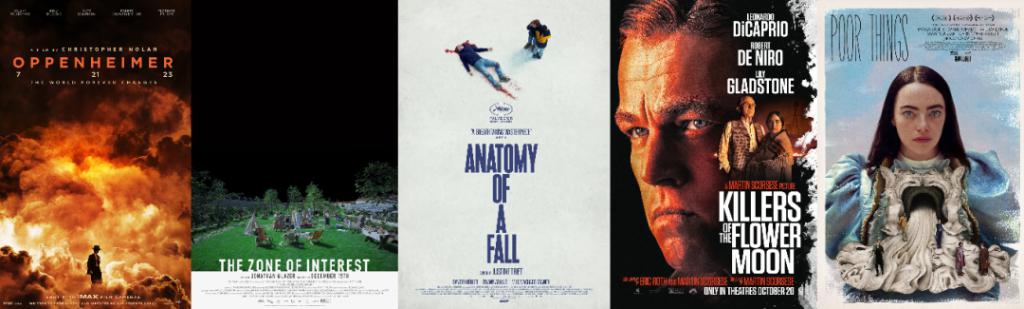 克里斯托弗 · 诺兰,《奥本海默》;乔纳森 · 格雷泽,《利益区域》;茹斯汀 · 特里叶,《坠落的审判》;马丁 · 斯科塞斯,《花月杀手》;欧格斯 · 兰斯莫斯,《可怜的东西》。