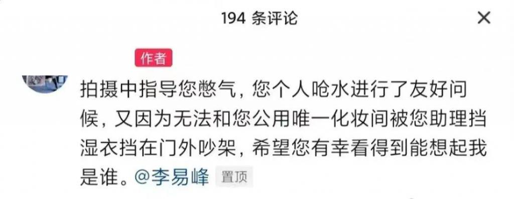 该网友还补充了不少被李易峰恶意对待的细节,他表示:拍摄中指导您憋气,您个人呛水进行了友好问候,又因为无法和您公用唯一化妆间被您助理挡湿衣挡在门外吵架,希望您有幸看得到能想起我是谁。