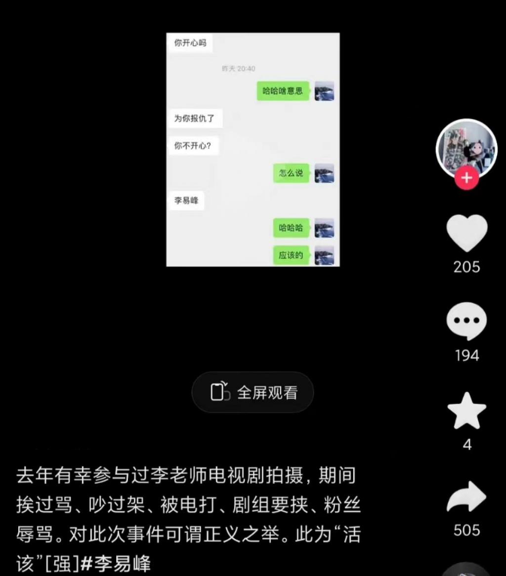 该网友在社交平台上发文称:去年有幸参与过李老师电视剧拍摄,期间挨过骂、吵过架、被电打、剧组要挟、粉丝辱骂。他还评论李易峰近期事件为 " 正义之举 ",称 " 此为活该 "。
