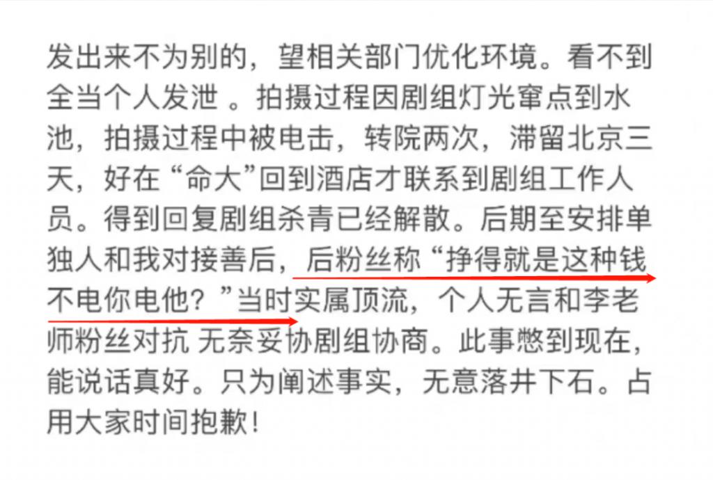 另外该网友也讲了自己这次发文的目的,希望相关部门能优化环境,看不到的话就纯属个人发泄一下。他自称拍摄过程中被电击,转院两次、伤势严重,恢复后联系到工作人员以后才得知剧组已经杀青。他还表示,当时李易峰还是顶流,粉丝们大言不惭地称 " 挣的就是这种钱,不电你电他?" 自己没有能力与李易峰的粉丝对抗,只能妥协和剧组协商。而如今终于有机会把这些事实说出来,很是舒畅。