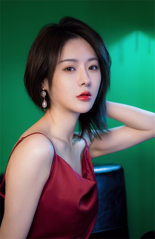 明星写真:莫寒红色吊带抹胸长裙时尚摄影,率性短发精致小女人