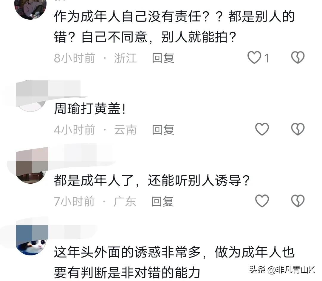 还有不少网友认为:作为一个成年人,女子自己没有辨别是非的能力吗?一开始就应该拒绝,没拒绝说明内心不抗拒,为什么当时不报警,事后发视频是什么目的?