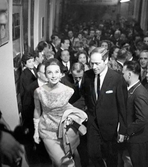 1956年11月16日,奥黛丽·赫本和梅尔·费雷尔在电影《战争与和平》首映晚会上,摄于英国伦敦。