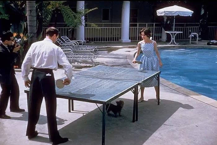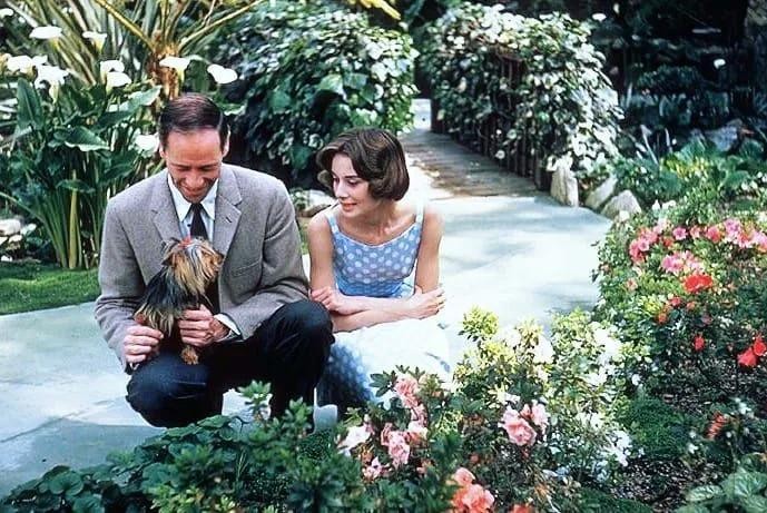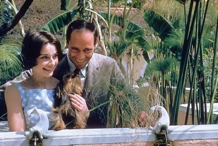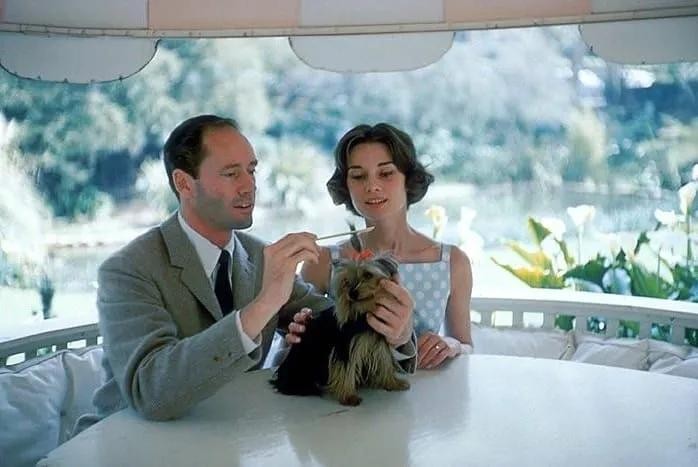 1957年3月27日,奥黛丽·赫本和梅尔·费雷尔在洛杉矶的Bel Air酒店。费雷尔送了一只小狗给赫本作为礼物,小狗的名字叫做“Mr.Famous”。