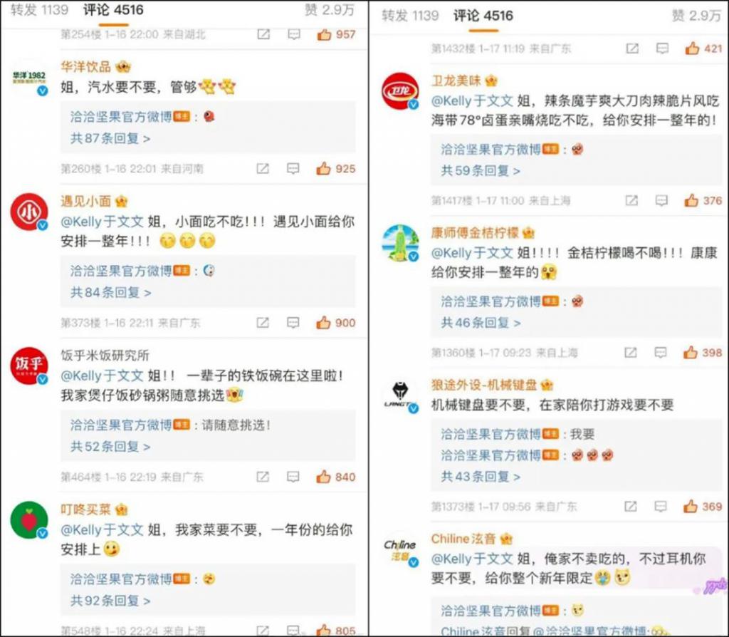 就连于文文也因这波操作,成为各大年货品牌的团宠:各大瓜子、辣条、快餐面厂家蜂拥而来,挣破头要给她寄一年份的零食。