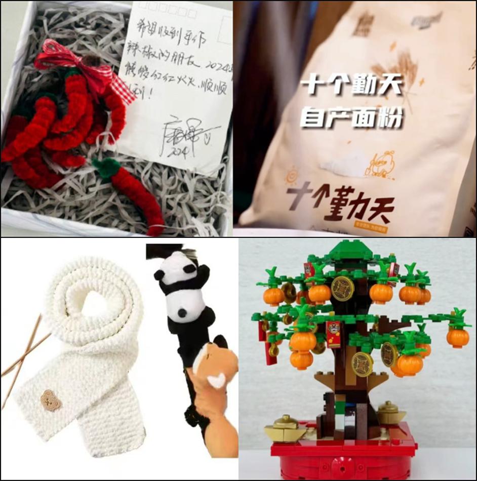 十个勤天送的是自己种出来的麦子磨成的面粉,许佳琪亲手织了一条围巾,杨紫送出自己拼的 " 柿柿如意 " 乐高,唐嫣送的是自己亲手编织的辣椒;