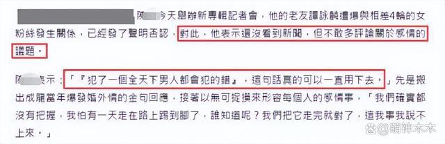 还有他在 " 谭咏麟与粉丝 " 风波一事上的态度也是一语成谶,当时他表示对不理解的事情不做评论,但是又搬出成龙名言 " 犯了一个全天下男人都会犯的错 ",称这句话可以一直用下去,言外之意就是即使事情发生了,那也无关紧要。结合上下文,这番辩解也是为自己铺路,表达了他对男女关系的蔑视,对女性的不尊重。