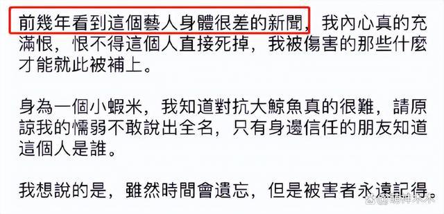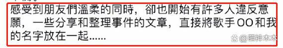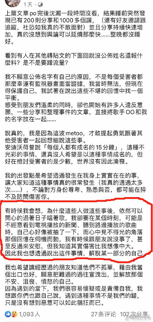 长文引发讨论后,该设计师个人也受到了网络骚扰,有质疑她爆料没真名蹭流量,也有收到善良朋友的安慰。当然,她也没避讳谈及网友把她和某歌手放一起讨论的话题,只是讲自己没有证据,且希望大家更多关注受到伤害的女性,鼓励大家拿出勇气,遇事的时候不要自我怀疑责备,错不在自己。