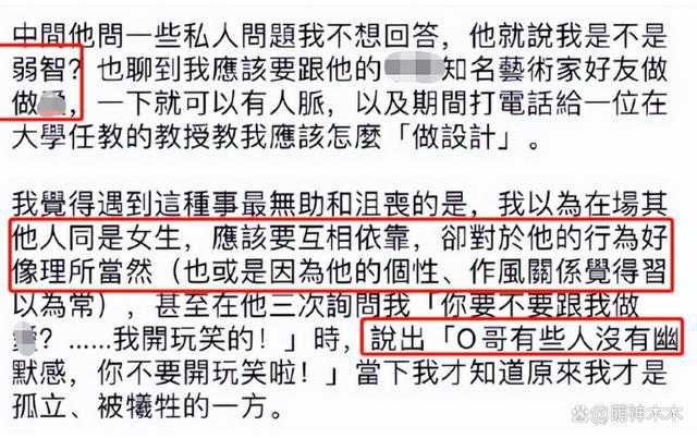 拒绝回答私人问题被骂,多次拿 "XO" 话题调侃要不要 " 搭人脉 ",还辩称开玩笑,面对这些遭遇,身边同场的女性同事没有给予帮助,自己拒绝 " 被开玩笑 " 的话也被忽视。