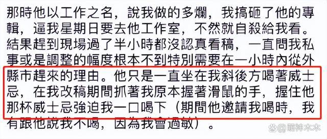 在改文案期间,对方趁机握鼠标摸手,还被强迫喝酒,女方多次明确拒绝自己酒精过敏,却被对方强硬灌下一口烈性洋酒。