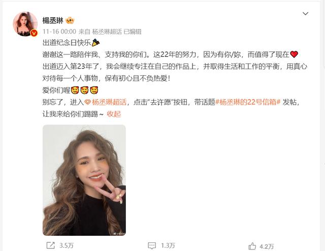 11 月 16 日这天也正是杨丞琳的出道纪念日,她发文庆祝出道 22 周年,感谢粉丝一路的陪伴,也表示会平衡好工作和生活,在做好工作的同时也会处理好和李荣浩的家庭生活。