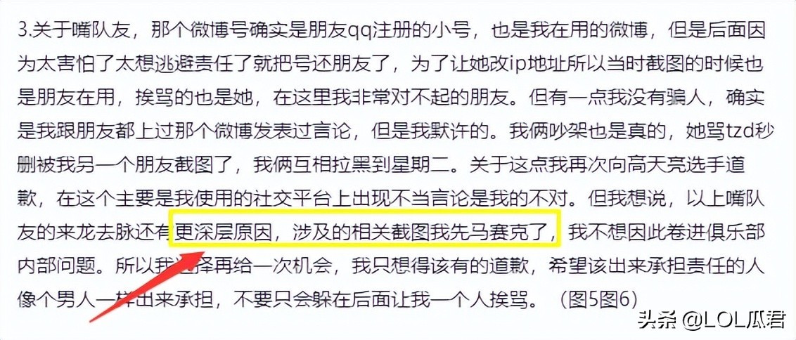 第三,嘲讽小天言论的账号她也有在用,确实不是编造谎言逃避责任,但账号出现不当言论,她也有责任,向高天亮选手道歉。同时,嘲讽小天有更深层次原因,暂时马赛克。
