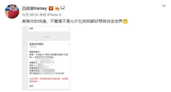 如果说前几个都只算是绯闻女友中的“前女友”,粉丝们还不以为然,这一次吕佳容“自曝恋情”真的是让众多“现女友”们觉得地位岌岌可危。原来在8月1号,吕佳容在微博上面发了一条消息,她写道,“谢谢你的快递,不管是不是七夕礼物我都好想告诉全世界。”不仅如此,吕佳容还配图一张快递信息,上面的寄件人就是李现。又是七夕又是礼物,让人觉得李现和吕佳容肯定在一起无疑了!再加上李现并没有出面否认,更加助长了这阵揣测之风。不过想想娱乐圈就是圈嘛,拍戏的熟面孔就那几个,两人认识也是理所应当。再加上吕佳容走的也是气质美女路线,肤白貌美大长腿,很符合李现公开的女友标准。
