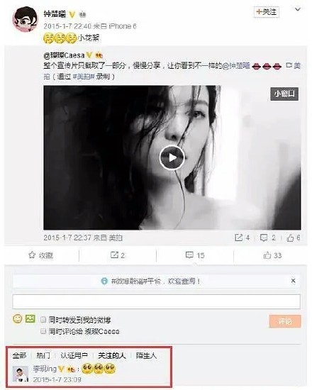 两个人在微博的互动也是很甜的,钟楚曦当时走的还是甜美可爱风,她在微博晒了自拍照后,李现还在下面评论“美到无法直视”,还在汤唯的微博下艾特钟楚曦“你女神的胸型跟你一样”。